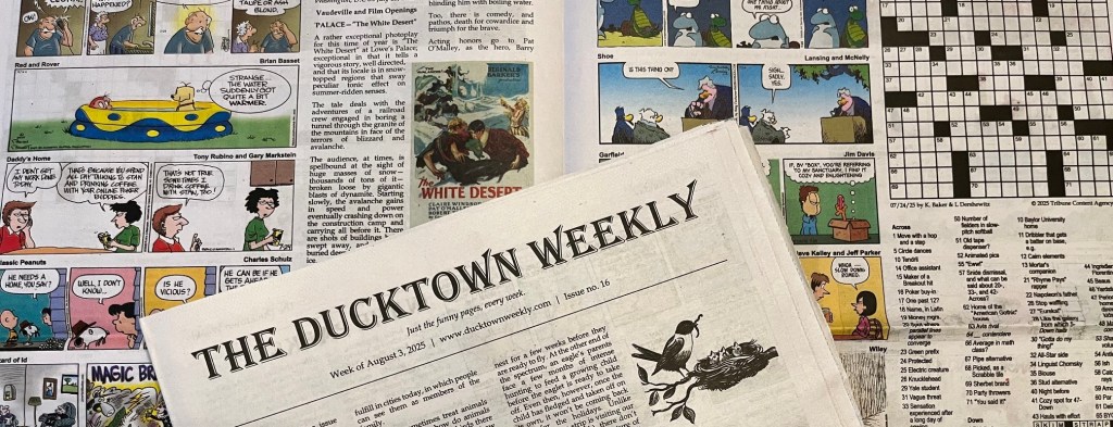 The Ducktown Weekly provides a full week’s worth of the best comics, puzzles, and features, on paper, delivered to your door. Every week we mail a 16-page issue: comics like Peanuts, Big Nate, and the Family Circus; the LA Times crossword; insight into the nation’s birds, parks, history, and more.